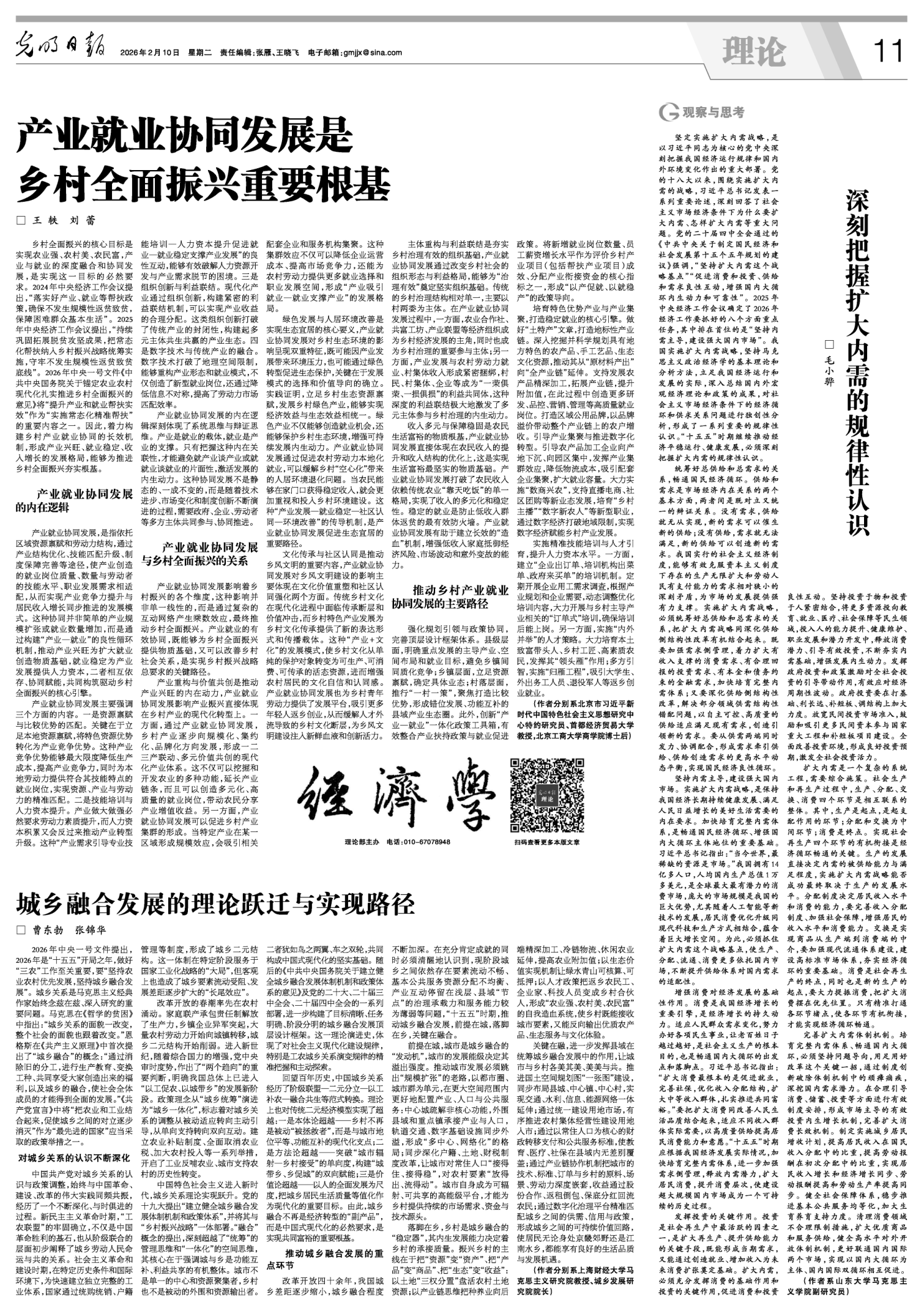近日,劳动经济学院王轶教授所著文章《产业就业协同发展是乡村全面振兴重要根基》在《光明日报(理论版)》(2026年2月10日)发表。文章探究了产业就业协同发展的内在逻辑、产业就业协同发展与乡村全面振兴的关系,并提出了推动乡村产业就业协同发展的主要路径。