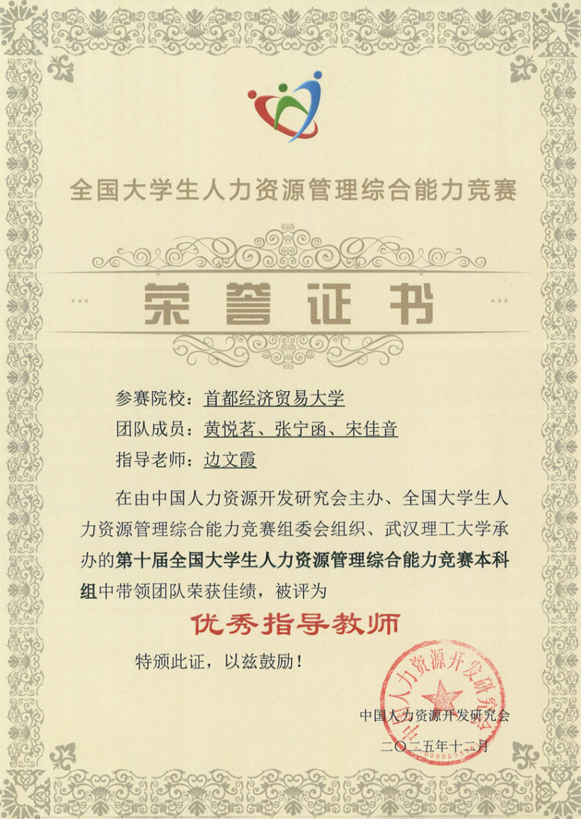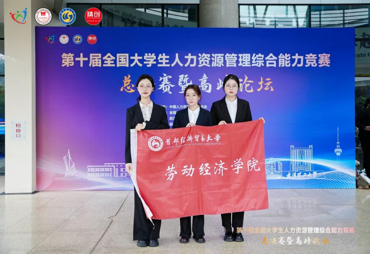 11月8日至9日,第十届全国大学生人力资源管理综合能力竞赛总决赛暨高峰论坛在武汉理工大学举办,全国117所高校的600余名师生、业内专家学者赴会。由2023级人力资源管理实验班黄悦茗、张宁函、宋佳音同学组成的劳动经济学院代表队在决赛中获得本科组一等奖,边文霞老师获得优秀指导教师称号。