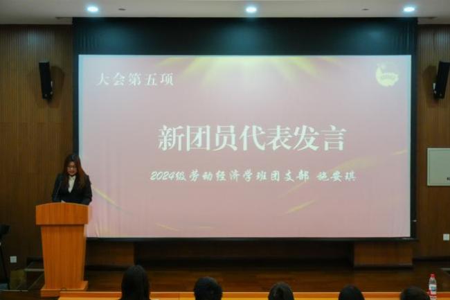 新团员代表、2024级劳动经济学班团支部施安琪发言。她分享了向团组织靠拢的成长历程,表达了成为团员的喜悦与自豪,并承诺将以“劳”为楫、以“经”为帆,在学习中锤炼本领,在实践中勇担使命,用青春行动回应时代召唤。