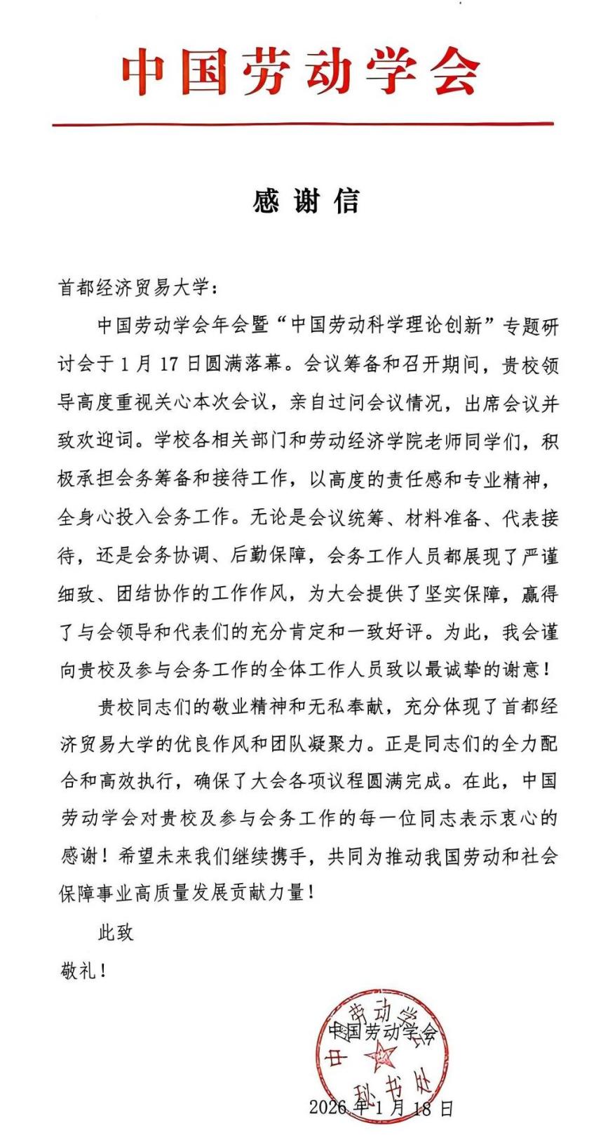 近日,中国劳动学会向首都经济贸易大学发来感谢信,向学校各相关部门和劳动经济学院筹备召开中国劳动学会年会暨“中国劳动科学理论创新”专题研讨会的全体工作人员致以最诚挚的谢意。