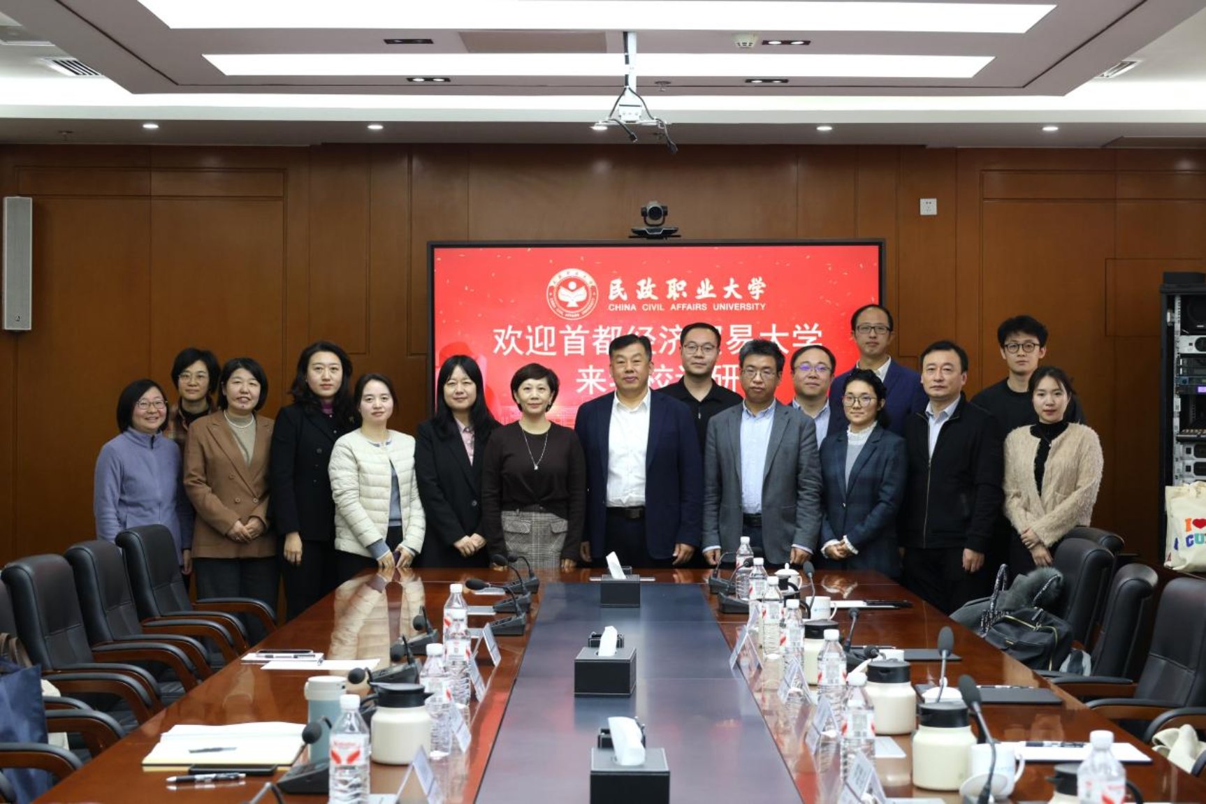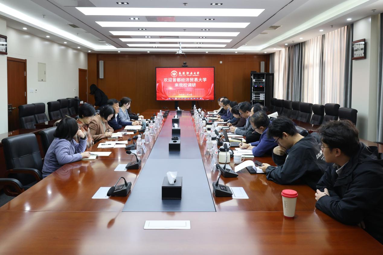 11月14日,首都经济贸易大学劳动经济学院党委书记何勤,党委副书记、院长罗楚亮,党委副书记柳艺,副院长苗仁涛、江华,挂职副院长王红以及学院教师代表赴民政职业大学开展调研交流活动。民政职业大学副校长何振峰,老年福祉学院副院长曹雅娟,社会工作学院副院长金娜与各学院负责教师热情接待,双方就相关领域合作与发展事宜展开深入沟通。何振峰主持座谈会。