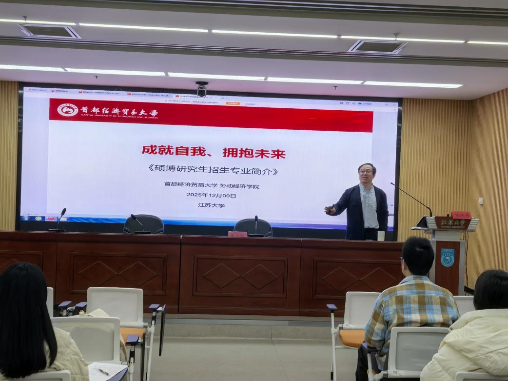 为搭建高校间人才培养交流桥梁,吸引优质生源报考,近日,首都经济贸易大学劳动经济学院面向江苏大学、贵州财经大学本科高年级学生及硕士研究生开展硕博研究生招生宣讲活动。本次宣讲以“成就自我、拥抱未来”为核心主题,全面展现学院学科实力、培养特色与发展前景,为有志深造的学子提供权威报考指引。