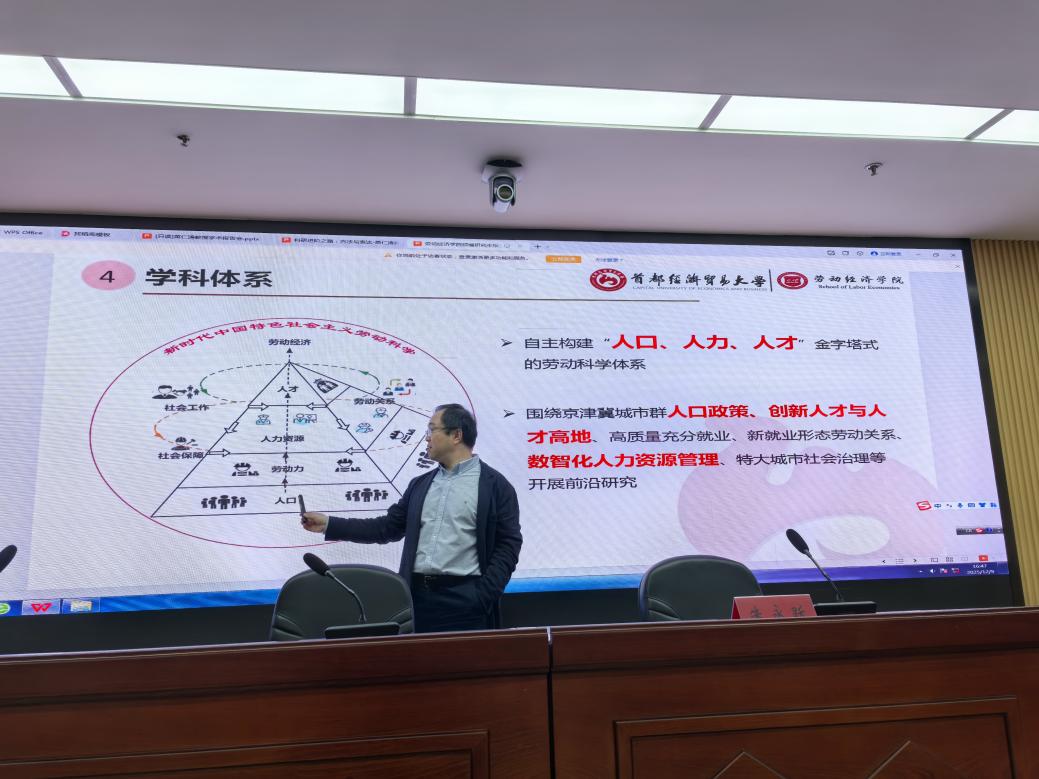 宣讲活动中,劳动经济学院副院长苗仁涛教授系统梳理了劳动经济学院的深厚发展底蕴。目前学院已构建起“学士—硕士—博士—博士后”层次完备的人才培养体系,拥有5个本科专业、6个硕士学位授予点、4个博士学位授予点及1个博士后流动站,形成了“人口、人力、人才”金字塔式的劳动科学体系。